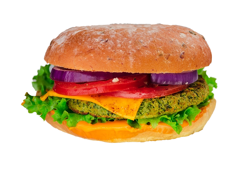 Falaffelburger, gegrillte Tomate, gegrillte Zwiebeln, Salat, veganer Schmelzkäse, vegane Majo-Ketchup-Senf-Sauce